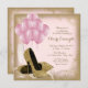 Convites de festas de aniversários cor-de-rosa e dourados, com belos calçados de salto alto, brilho dourado, balões cor-de-rosa, champanhe e pérolas num fundo roxo cor-de-rosa e dourado. Este elegante convite de aniversário cor-de-rosa e dourado é facilmente personalizado para o seu evento simplesmente adicionando os seus detalhes no estilo de letra e cor, redação e layout da sua escolha. Você também pode mover ou excluir o champanhe e os balões. Esta é uma design impressa sem joias reais, pérolas, brilho, etc.