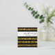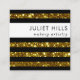 Um cartão de visita de vidro quadrado com um brilho dourado e design de faixa preta. Os detalhes de seu contato, incluindo telefone, email, site e identificador de mídia social, estão no verso. Você pode personalizar ainda mais para remover ícones das mídias sociais que não usa e reposicionar ícones, se necessário.