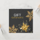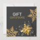 Design de férias de alta qualidade elegante com flocos de neve glamourosos de ouro brilhante e caixa de presentes num fundo antracita de cinza negra. Esta certidão festiva é perfeita para a sua pequena empresa ou para oferecer amigos e família, especialmente para o Natal.