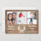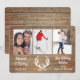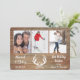 O recurso na frente desta placa de feriado "Casado e Feliz" é o seu grupo de fotos no topo. No centro abaixo das fotos está uma imagem da silhueta branca de galhadas decoradas com um punho holly. O texto branco do script à esquerda diz "Casado & Feliz" com seu ano personalizado e mais campos de texto personalizados à direita. Tudo é colocado em um painel de madeira azul brilhante. A parte traseira da placa tem a imagem de fundo da madeira.