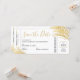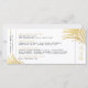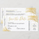 Design de folha de folha de folha de folha de folha de folha de ouro moderna, elegante e simples num destino de praça tropical de moda e divertida salve o cartão de ponto que parece um bilhete de passagem de avião. Todas as partes do nosso modelo de bilhete de avião chic são editáveis para que você possa criar uma para se adequar às suas cores de casamento e ao seu tema. Há espaço para adicionar detalhes de viagem no verso, ou apagar o design no verso se os detalhes ainda não estiverem prontos, você pode adicionar uma foto ou seu próprio monograma de casamento usando o designer avançado, basta clicar em 'personalizar mais'.