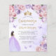 Este adorável convite da quinceañera apresenta uma fronteira de roxo lilás e rosas rosa pinceladas em um fundo de aquarela roxo. Uma tiara dourada, uma morena num vestido princesa roxo e pequenas borboletas roxas decoram o texto. A palavra "Quinceañera" e o nome do convidado de honra aparecem num elegante guião dourado, com o texto remanescente na fonte serif cinza.