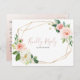 Cumprimente seu evento de casamento rústico com este cartaz de seleção de cartaz de entrega de flores geométricas douradas. O design apresenta flores brancas e cor-de-água cor-de-rosa com folhas verdes, enfeitando uma moldura geométrica dourada.