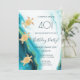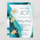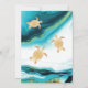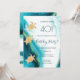 Este elegante convite para um aniversário na praia ou na praia apresenta tartarugas tribais douradas num fundo de cor-de-água de tinta azul-lacrimogênea.