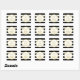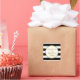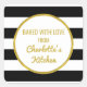 Etiquetas de folga de texto personalizado com padrão de listras preto e branco e detalhes dourados.