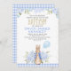 Dourado Blue Floral Peter Rabbit Baptism Convite para o batismo doce Quadrinho para um bebê com uma ilustração fofa de Peter Rabbit, vários arranjos florais azuis para bebês, pontos falsos de brilho de ouro e uma rubrica falsa de folha de ouro. O design também apresenta um padrão de xadrez azul. Essa design é ideal para alguém que procura um batismo ou um convite batizante temático de Peter Rabbit.