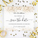 Uma cinta e uma moda Salve a placa Date para uma festa de aniversário 18th (ou qualquer idade). Um fundo branco de na moda, decorado com poeira falsa dourada. Personalize e adicione uma data, nome e texto. O texto: Salvar a Data é gravado com um script de estilo com letra de tendência grande com alternâncias.