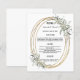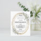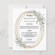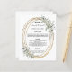 Um fundo branco. Um quadro de aparência de ouro falsa, decorado com verde-sábio. Personalize e adicione seus nomes, data e menu. Texto preto. 1 folha = 1 menu impresso borda a borda.