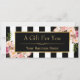 Certificado de presente Dourado Modelo de Stripes Brancas Florais Pretas para você. Este design é perfeito para Florista, Planejador de Eventos, Freelancer, Coordenador de Casamentos, Fotografia, Designer Interior, Artista de Maquiagem, Terapêutica de Massagem, Estilista de Cabelos, Técnico de Unhas, Beauticista, Cosmetólogo, Loja de Salões SPA e muito mais. (1) Para mais personalização, clique no link "personalizar mais" e use nossa ferramenta design para modificar esse modelo. (2) Se precisar de ajuda ou itens correspondentes, entre em contato comigo.
