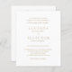 Ouro falso elegante, tudo em um convite de casamento orçamentário com um design simples e mínimo com os nomes da noiva e noiva em uma fonte serif tradicional e o meio e sobrenomes em um roteiro elegante de caligrafia. A parte traseira tem os seus detalhes de convidado, bem como um código QR opcional. Se preferir, você pode remover o código QR na ferramenta de edição de design. Um estilo clássico que é perfeito para um casamento formal.
