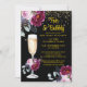 Um convite moderno para festas de férias Vésperas de ano novo com vidro de champanhe e florais, brilho de ouro em fundo de ouro. Tema de diversão. Aquarela e brilho dourado.