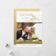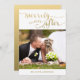 Escolha elegante para seu primeiro cartão com fotos de Natal para enviar para a família e amigos como recém-casados. Dourada escrita manuscrita "Merrily Ever After". Design© Elke Clarke. Dourado plano de inclinação na parte traseira do cartão.