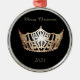 Enfeites de natal mostrado em forma redonda com uma Dourada e preta coroa e fundo. Mostrada com fita vermelha e prateada. Mensagem de Natal feliz. Personalize este item com o seu nome pessoal de concurso, etc. ou comprar como está.