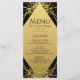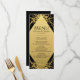 Um cardápio de casamento com um grande gráfico de diamante geométrico dourado com um borrão de ouro reluzente sobre fundo preto puro. Você pode adicionar seus detalhes clicando no link personalizar. Esta é parte de uma suíte de casamento luxuosa que pode ser totalmente personalizada.