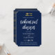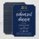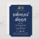 Um convite clássico de janto de ensaio moderno, que inclui uma folha de ouro falsa e uma faca sobre um "janto de ensaio" de pincel, saudando tudo num esquema de cores para marinho, branco e ouro.