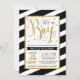 Convites modernos de chuveiro de bebês preto e magro de ouro. Este design de tendência apresenta faixas diagonais em negrito, pontos confetti e fonte de script. Os designs são ilustrações/gráficos impressos planos - NÃO O GLITTER REAL.