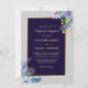 Este bonito convite para o casamento apresenta buquês florais modernos em cores predominantes de azul e violeta no canto superior direito e inferior esquerdo. Os buquês diferem um do outro, mas são semelhantes. O topo tem toques de ouro pálido. Cada uma delas inclui uma pena de pavão colorido estilo boho. As imagens são colocadas sobre um quadro brilhante de ouro, com fundo azul marinho. Seu texto personalizado está em ouro claro no centro. O centro enquadrado é colocado sobre uma cinza prateada. A parte de trás do convite é azul marinho de correspondência sólida. Elegante, moderno e apropriado para casamentos em qualquer estação!