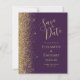 A borda esquerda deste elegante casamento moderno salve o cartão de data apresenta uma borda falsa dourada. O texto personalizável combina manuscrito pálido e dourado, fontes copperplate e itálico em um fundo roxo escuro. O verso apresenta um púrpura escuro e design dourado correspondentes.
