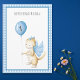 Cartão personalizado de primeiro aniversário bonito com ilustração de um dragão segurando um balão azul. Ilustrada e projetada por Patricia Alvarez.
