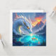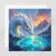 Quebra-cabeça fictício surreal. Um belo dragão branco ilustrado olhando para um peixe dourado enquanto os vulcões erupem no fundo.