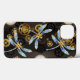 Marcadores e teclas antigas com engrenagens de ouro e latão, decoradas com libélulas mecânicas e boias em fundo castanho e listrado.