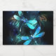 Duas libélulas transparentes, luminosas, turquesas, desenhadas artisticamente sobre fundo noturno, com algas e vagalumes luminescentes do lago. Dragonfly brilhante.