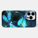 Duas libélulas transparentes, luminosas, turquesas, desenhadas artisticamente sobre fundo noturno, com algas e vagalumes luminescentes do lago. Dragonfly brilhante.