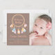 Loja de sonhadores tribal boêmia com miçangas e penas em cores pastéis. Cartão de nascimento neutro em termos de gênero, pode ser usado para um menino ou para uma menina. Personalize com sua foto e informações do bebê.