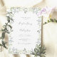 Este convite sonhador baseia-se numa pintura aquosa de gramíneas e oliveiras selvagens num belo jardim grego. As delicadas cores pastel vão se encaixar com muitos temas de casamento, melhorando seu dia, mas não assumindo. As ervas selvagens, as azeitonas e o rosmaninho encontram-se delicadamente dispostos num quadro de fronteira em torno do texto personalizável. O inverso é um tom verde macio - que pode ser mudado para o que você quiser.