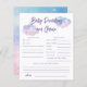 Previsões de bebê de chá de fraldas e cartão de conselho sonhador e elegante em nuvem nove com temas e ilustrações de cor d'água de nuvens roxas e rosa. Um jogo perfeito para jogar durante o chá e definitivamente será um excelente! O cartão aos hóspedes para predizer como o bebê se pareceria.