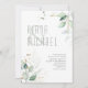 Arranjos elegantes e inspirados na natureza, incluindo goma azul eucalipto com esboços de folhas de ouro e ouro junto com layouts únicos de design, fazem disso um maravilhoso jogo de casamento para qualquer época do ano. O convite de casamento mostrado aqui mostra bordas de folhagem exuberantes no rosto frontal e textura macia e aquosa no verso. Veja o link de coleção nesta página para ver todos os itens correspondentes neste belo design ou ID817 de pesquisa para ver outras peças e opções de cor para este conjunto.