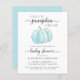 Um convite de chá bonito, alegre e econômico feito por um menino bebê apresentando "A Sweet Little Pumpkin Is On Your Way" escrito em uma mistura de tipografia moderna de cinza mole e roteiro de na moda, e uma aquarela azul pastel de uma abóbora. Você pode personalizar o nome da mãe e os detalhes do chá em uma simples tipografia de cinzas.