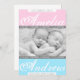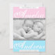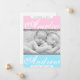 Casual e elegantemente simples, este fundo de dois tons e a tipografia de na moda estabelecem a palco de um lindo anúncio de nascimento gêmeo para seus novos feixes de alegria. Este cartão é uma forma adorável de apresentar os novos bebês à família e aos amigos.