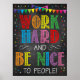 TRABALHAR DURO E SER BOM PARA PESSOAS! Um poster excelente para ficar em uma sala de aula ou em um escritório escolar de todos os tipos para lembrar as crianças de trabalhar duro e ser legal! Duas regras simples que vão longe! Possui um design com cores divertidas, brilhantes e alegres.