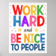 DURO DE TRABALHO E SEJA AGRADÁVEL AO POSTER PESSOAS A poster para pendurar em uma sala de aula ou em um escritório escolar de todos os tipos para lembrar as crianças de trabalhar duro e ser legal! Duas regras simples que vão longe! Possui um design com cores divertidas, brilhantes e alegres.