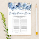 Este é um jogo de Chá de fraldas de Raça do Nome Floral Azul Dusty. *Raça do nome do bebê - Anote um nome de bebê que começa com cada letra. A pessoa com mais nomes ganha!