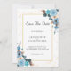 O elegante salvador da data design apresenta um buquê de flores azuis poeirentas de cor d'água e um elegante conjunto sofisticado de fontes. Visualize o link de coleção nesta página para ver todos os itens correspondentes nesta bela design.