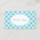 Um bonito padrão de gingham azul decora este cartão de visita profissional. Personalize este cartão de visita de estilo retrô para atender às suas necessidades. Alterar o texto, o tamanho da fonte, etc... Adicionar ou eliminar texto. O design é de arte original. Use este cartão de visita profissional para uma butique, padaria, creche, creche, alterações, padaria, florista, cosmetólogo, nomeações, cabeleireiro, salão, cama e café da manhã, restauração, decoração caseira, design de interiores, etc..