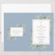 Apresentando delicadas folhas de cor d'água verde sobre fundo azul empoeirado e um elegante crucifixo de ouro, este batismo ou programa batizante pode ser personalizado com suas informações especiais. Projetado por Thisnotme©