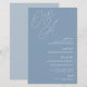 Um belo cartão de cardápio de casamento baseado em tipografia, que apresenta suas iniciais em letras de script sobredimensionadas no topo, em tons em tons para um efeito de marca d'água. Personalize com seus itens de menu embaixo, alinhados à direita. Nossa Mancha Azul Dusty é uma mistura elegante de blues etéreos, com cinzas brancas e azuis em um fundo azul médio empoeirado.