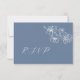 White line art cherry blossoms on a dusty blue background. Elegant wedding RSVP card. Botanical hand drawn design.