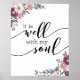 Design de tipografia com caligrafia e palavras em branco sobre fundo roxo escuro, "É bem com minha Alma." O design de tipografia está centrado em lindas e coloridas flores aquáticas (flores coloridas ilustrativas aparecem nos cantos superior esquerdo e inferior direito do design).