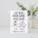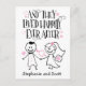 Parabéns a alguém no casamento ou aniversário de casamento com este cartão único em estilo de lettering feito à mão que apresenta a mensagem, "E eles viveram felizes para sempre. O design inclui ilustração divertida em estilo giz de noiva e noivo com buquê, flores e corações em fundo branco. Espaço abaixo para os nomes dos noivos ou sua própria mensagem personalizada.