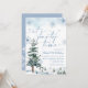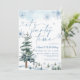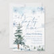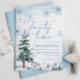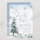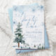 Convite de aniversário da Maravilha Azul de inverno. Com pinheiros e flocos de neve, aquarela.
