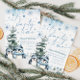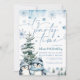 Convite de aniversário da Maravilha Azul de inverno. Com pinguim, pinheiros e flocos de neve, aquarela.