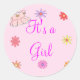 Use este adesivo rosa "É uma garota" para selar seus anúncios de nascimento ou convites para chás de fraldas. O adesivo/rótulo apresenta um fundo cor-de-rosa com dispersões de flores e as palavras "É uma rapariga".