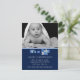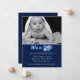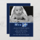 Na moda personalizado anúncio de nascimento de bebê feito em azul escuro, com uma borda azul clara, no topo, e texto gráfico colorido divertido Lendo É um Menino. Adicione a foto do seu bebê ao topo do anúncio e personalize o texto branco, com a informação de nascimento do seu bebê. Doce e na moda para anunciar a chegada do seu bebê ao mundo.