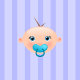 Um cartões de agradecimentos de chá de fraldas giro em tons azuis, um lindo rosto de bebê com um pacificador em um fundo azul esticado.