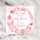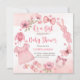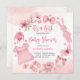 É uma roupa de bebê e brinquedos, flores, borboletas, modelo de convite para chá de fraldas.