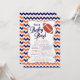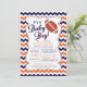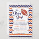 Marinho moderno e chá de fraldas de esporte ousado e brilhante, cor de laranja, com um futebol bonito. Nossa, é um convite para o futebol de um menino bebê é colocado em um plano de fundo zigzag chevron fofo e tem um retorno para um toque especial extra. Perfeito para um pequeno chá de fraldas desportivo